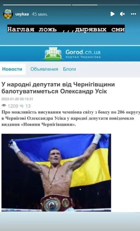 Портал "Новости Черниговщины" опубликовал новость о том, что Усик будет баллотироваться в депутаты. Боксера якобы рассматривают как возможного кандидата в депутаты по 206 округу в Чернигове.