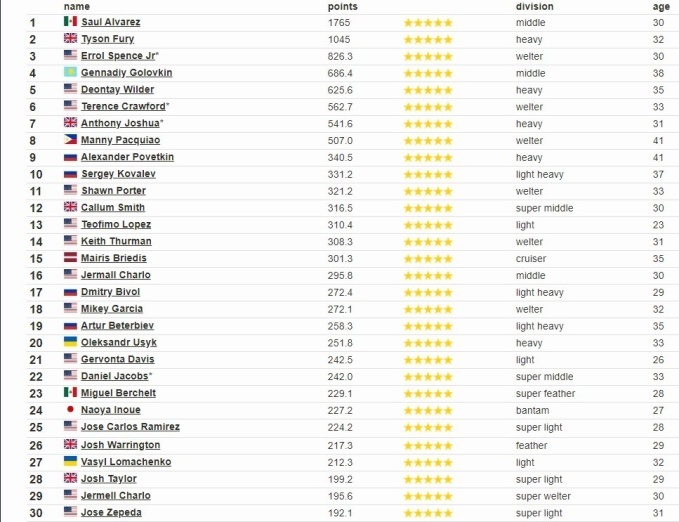 Согласно их данным, первым в рейтинге идет мексиканец Сауль Альварес. На втором месте расположился британец Тайсон Фьюри, а замкнул тройку лучших американец Эрол Спенс.
