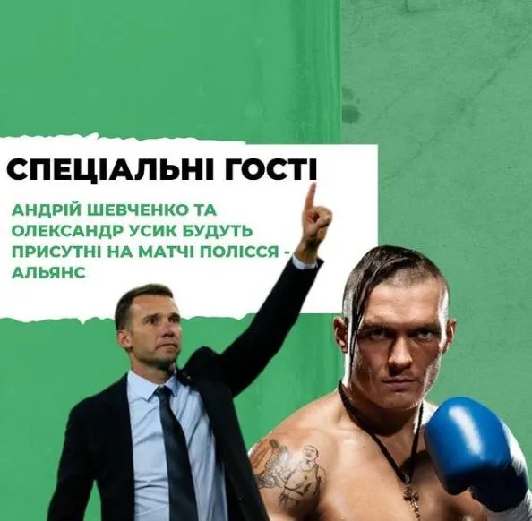 Бывший тренер сборной Украины Андрей Шевченко и боксер Александр Усик посетят матч 6 тура первой лиги Полесья – Альянс.