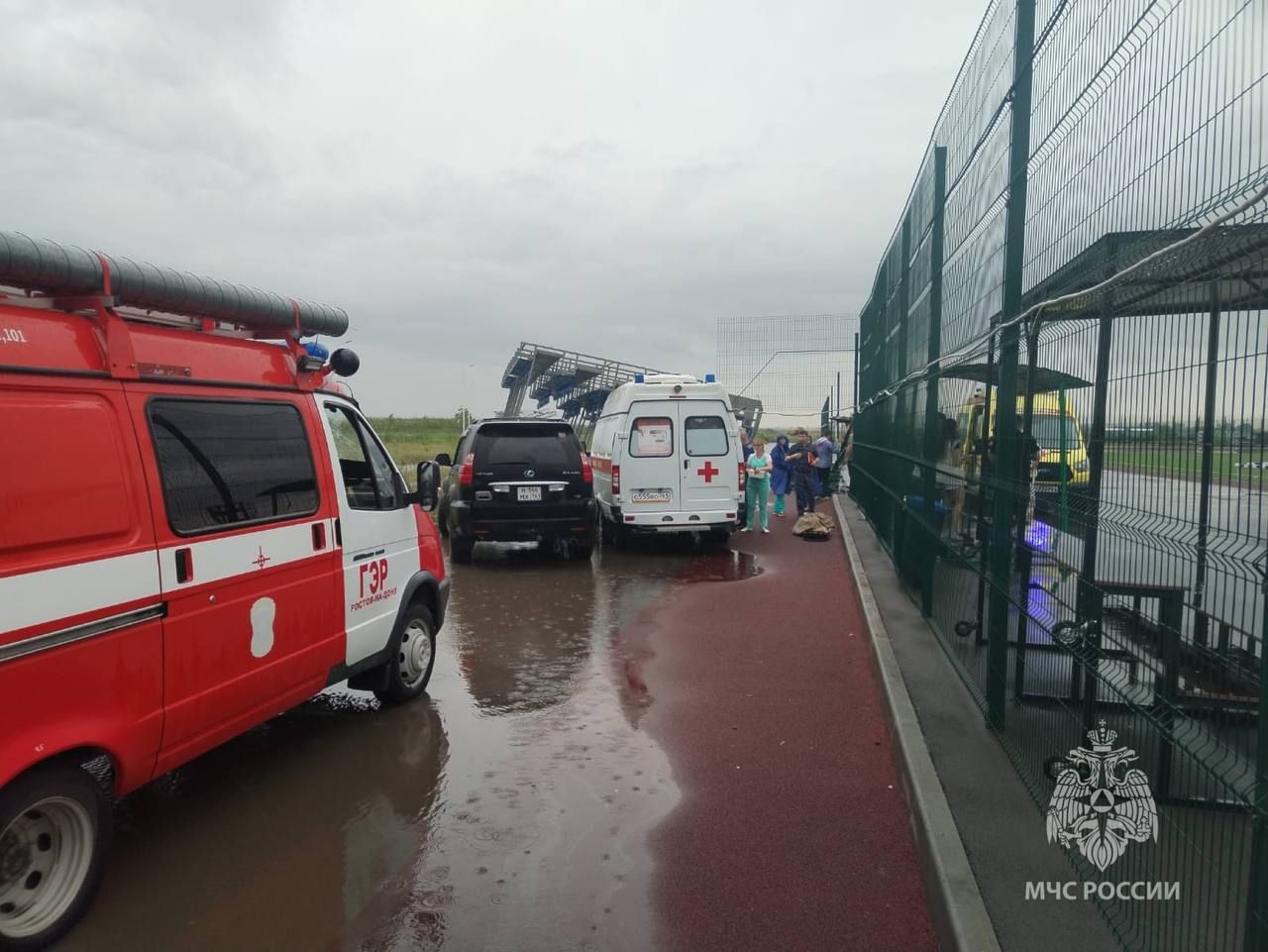 На территории спортивного комплекса проходили соревнования по футболу между детьми 12 – 13 лет. В Ростове 30 мая было объявлено штормовое предупреждение, однако футбольный матч все равно решили проводить. Среди игры началась гроза с дождем, поэтому дети вместе с болельщиками спрятались под трибунами.