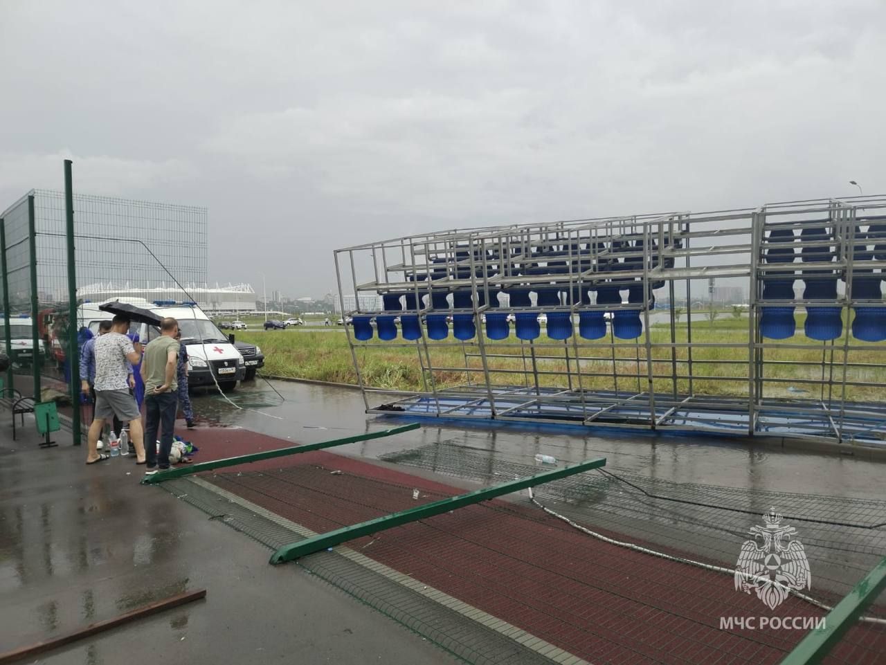 От шквального ветра конструкция опрокинулась. По последним данным известно о 26 пострадавших, их количество постоянно увеличивается. Одна женщина-болельщица погибла в карете скорой от полученных травм. Почти половина пострадавших – дети. В тяжелом состоянии сейчас одна женщина и двое детей.