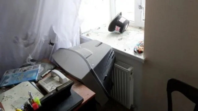 Взрывной волной и осколками боеприпасов разбиты окна, поврежден фасад здания.