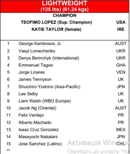 Ломаченко остался при своих позициях, а вот Беринчик поднялся с 4-й ступеньки. Лидером рейтинга является Джордж Камбосос. Он должен стать следующим соперником Теофимо Лопеса. В бою с австралийцем Теофимо должен защитить титул.
