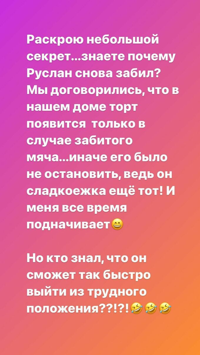 "Раскрою маленький секрет... Знаете почему Руслан снова забил? Мы договорились, что в нашем доме торт появится только в случае забитого мяча. Иначе его было не остановить, ведь он такой сладкоежка! И меня постоянно подбивает. Но кто знал, что он сможет так быстро выйти из затруднительного положения", – шутливо написала она.