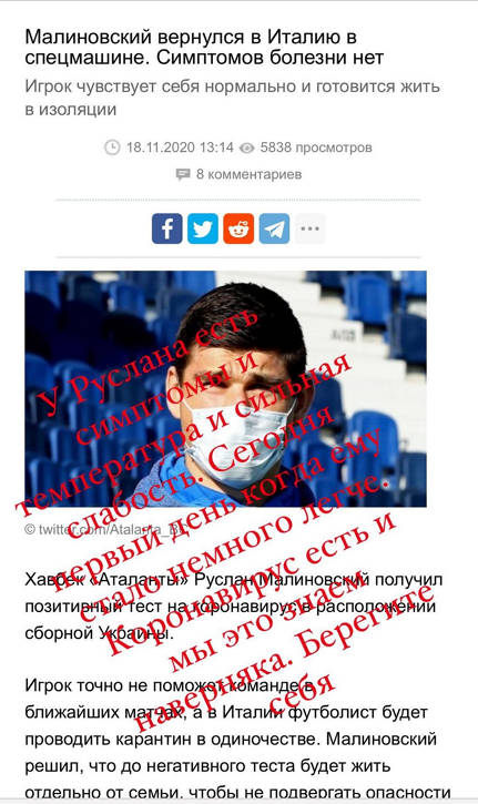 - 17 ноября, в день матча против Швейцарии, стало известно о положительных тестах у Руслана Малиновского, Сергея Кривцова и Жуниора Мораеса. При этом двое последних за месяц до того уже были инфицированы коронавирусом и отбыли самоизоляцию, в их организме должны быть антитела.