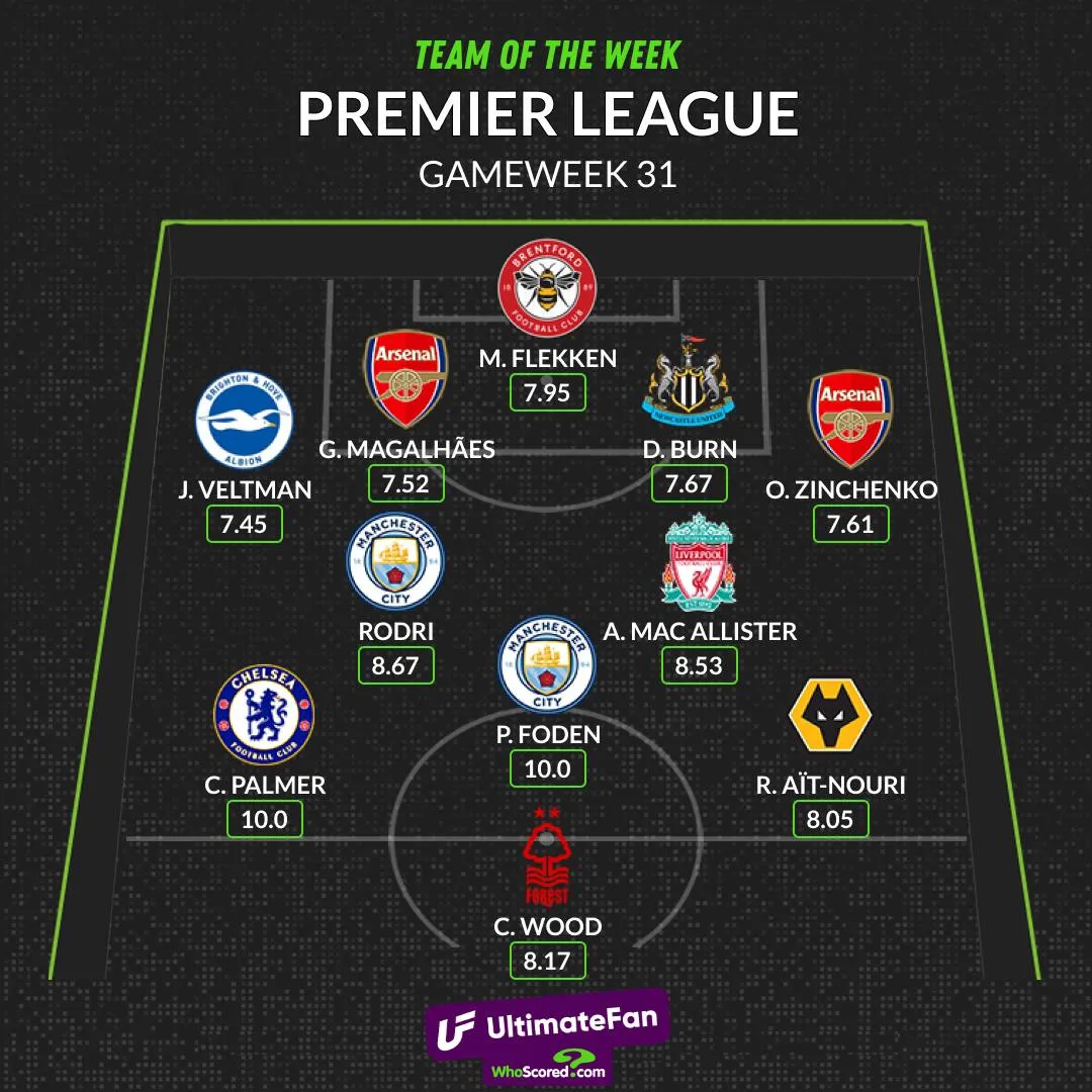 Символическая сборная 31-го тура АПЛ по версии WhoScored