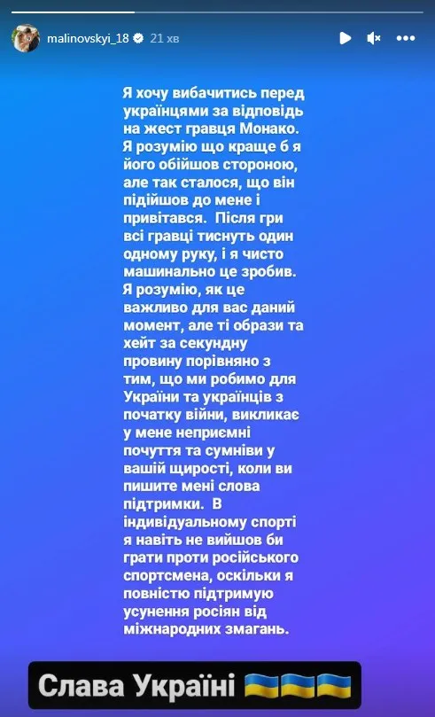 "Я хочу вибачитися перед українцями за відповідь на жест гравця Монако. Я розумію, що краще б його обійшов стороною, але так сталося, що він підійшов до мене і привітався. Після гри всі гравці тиснуть один одному руку, і я чисто машинально це зробив", – написав Маліновський.