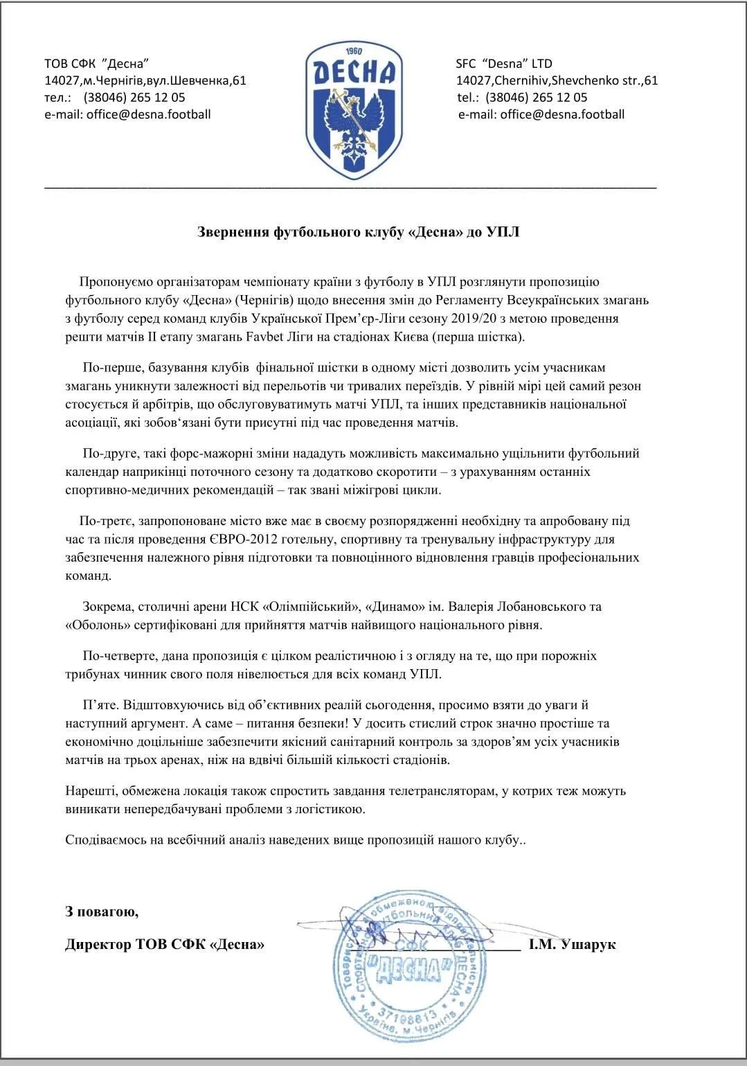 Президент "Десни" Володимир Левін повідомив про звернення чернігівського клубу до УПЛ з пропозицією провести 9 турів чемпіонату на київських стадіонах.