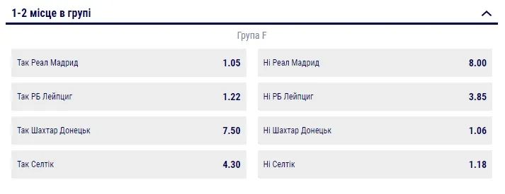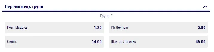 Для прикладу, на те, що Шахтар стане переможцем групи – коефіцієнт 46. А на вихід з групи (перше або друге місце) – 7,5. Більше ймовірним в цьому випадку те, що "гірники" посядуть місце, нижче другого – коефіцієнт 1,06.