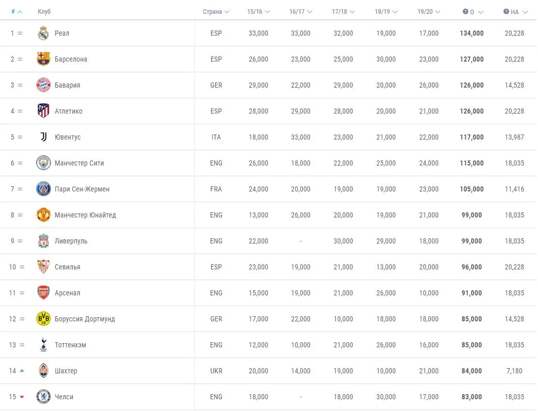Третя у рейтингу – мюнхенська "Баварія" – 126 балів.
