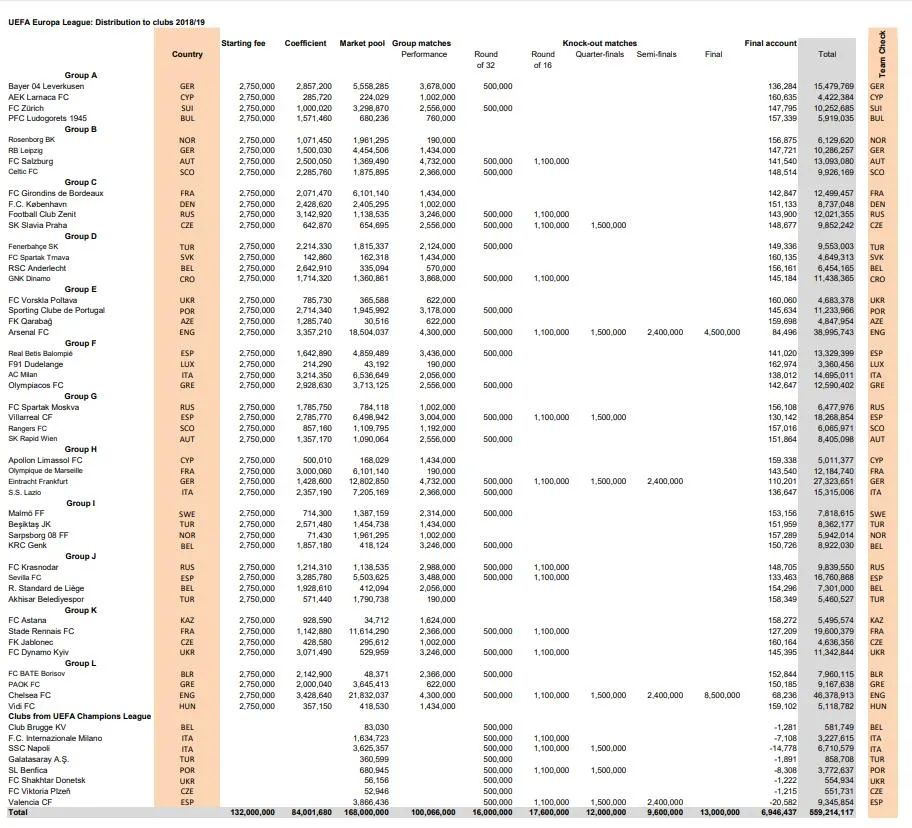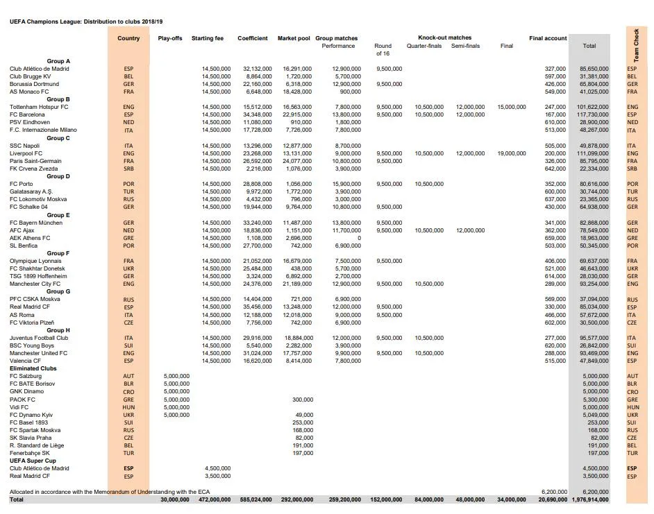 Виплати учасникам Ліги чемпіонів УЄФА-2018/19
