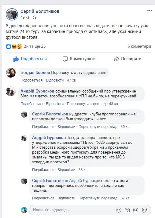 У коментарях під дописом журналіста Сергія Болотнікова у фейсбуці прессекретар "Шахтаря" Андрій Бурлаков заявив, що відновлення матчів УПЛ 30 травня не було затверджено.