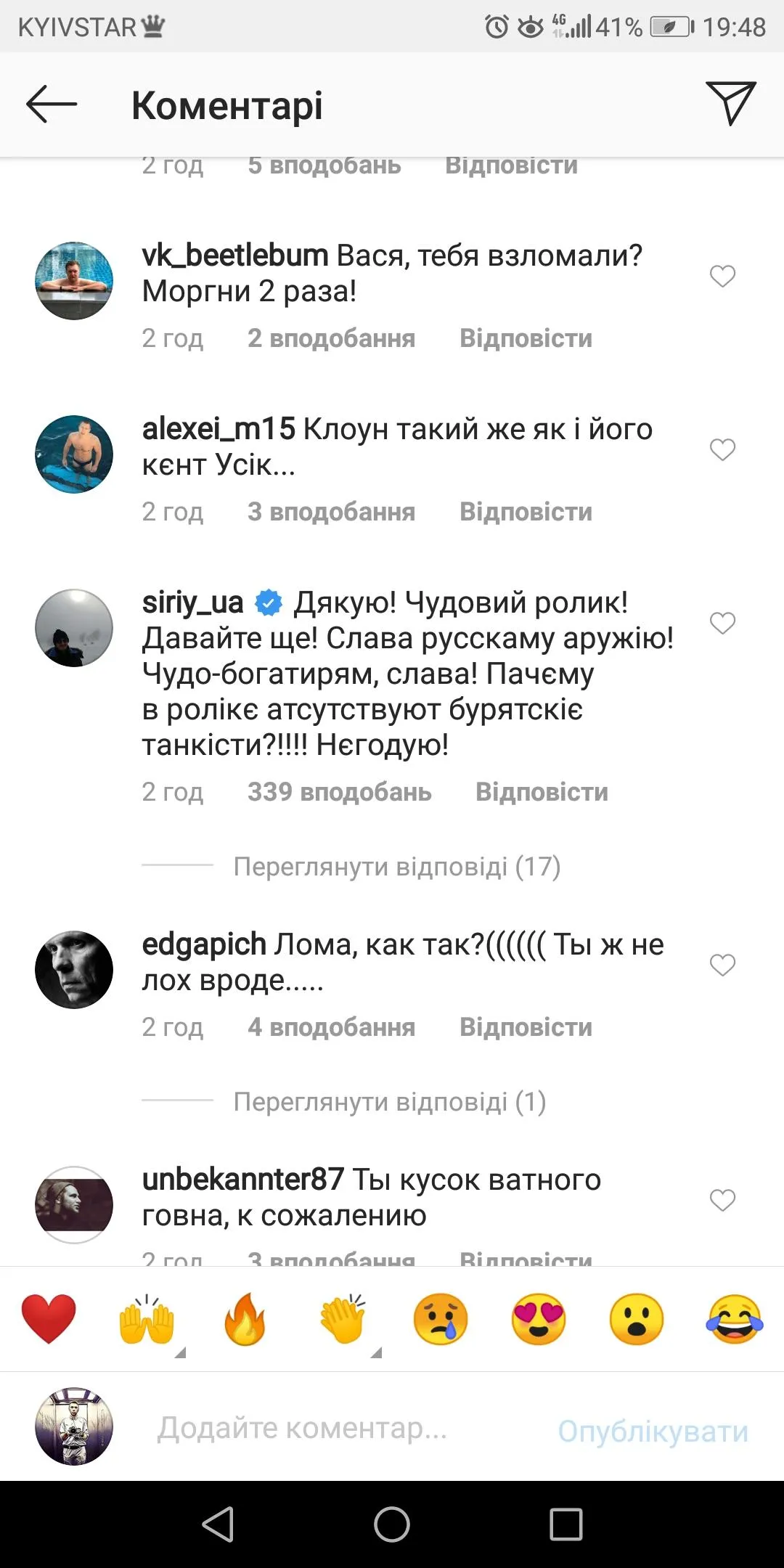 "Дякую! Чудовий ролик! Давай ще! Слава русскаму аружію! Чудо-богатирям, слава! Пачєму в ролікє атсутствуют бурятскіє танкісти?!!!! Нєгодую!", – іронічно прокоментував це відео шоумен Сергій Притула.