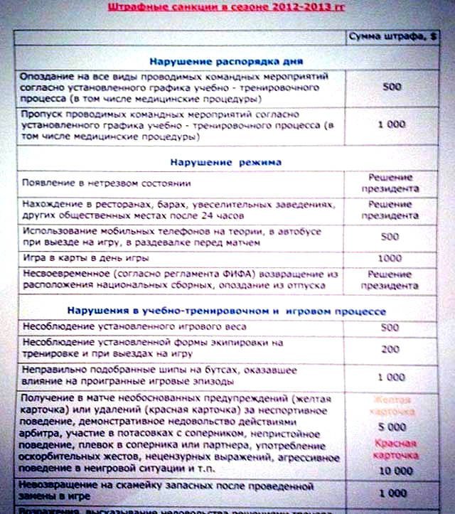 Також у 2013 році в мережі з'явилося фото з "прайсом" на штрафи футболістів "Динамо". Тоді за неспортивну поведінку в грі або непотрібний "гірчичник" футболіст "Динамо" міг бути оштрафований на суму від 5 тисяч до 10 тисяч доларів.