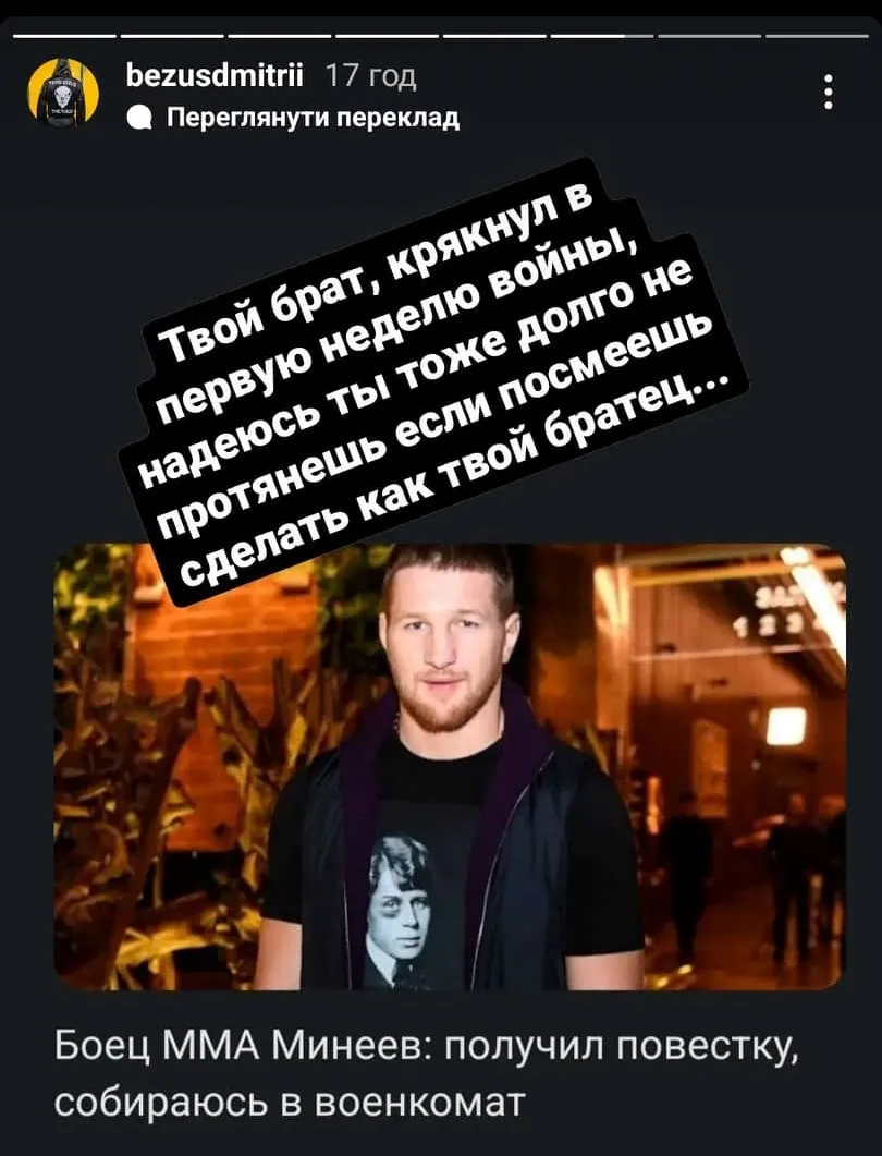 Зухвалому росіянину відповів український боксер Дмитро Безус. Він опублікував в себе сторіс в інстаграм з дописом "Твій брат крякнув першого тижня війни, сподіваюся, ти теж довго не протягнеш, якщо посмієш зробити, як твій братик..."