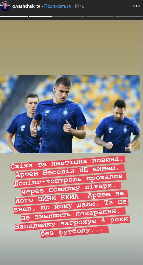 Артем Бєсєдін не винен. Він провалив допінг-контроль через помилку лікаря. Його вини тут немає. Артем не знав, що йому дали. Та це не зменшить покарання. Нападнику загрожує 4 роки без футболу,