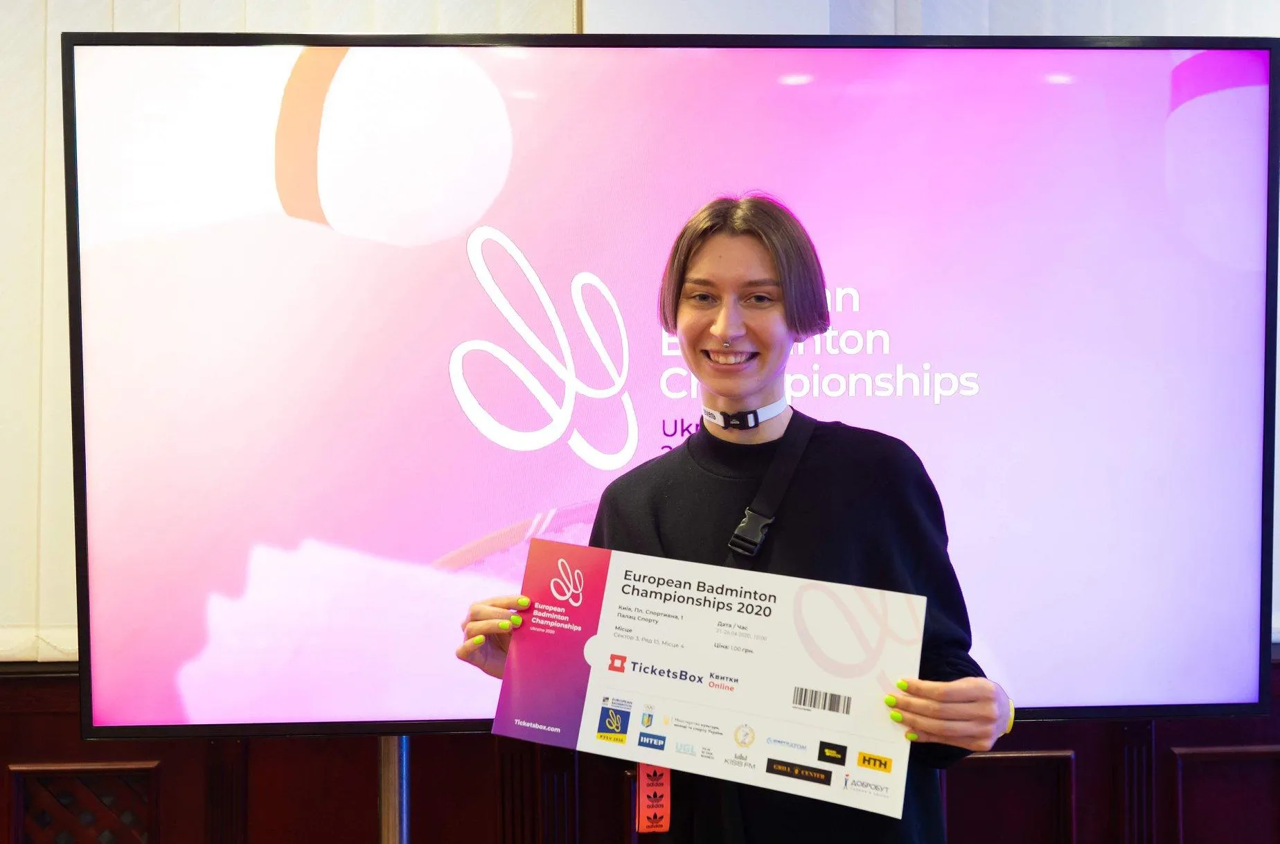 Першою володаркою квитка стала авторка айдентики чемпіонату – Віолетта Нагорна. Молода дизайнерка з Харкова, зокрема, створила офіційний логотип заходу, який поєднує у собі обриси волана та національного герба України. Логотип був обраний голосуванням на відкритому конкурсі та схвалений Європейською конфедерацією бадмінтону.