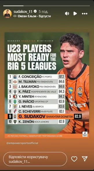 Авторитетний ресурс CIES Football Observatory опублікував список футболістів, які найбільш готові до переходу в один з топ-5 європейських чемпіонатів. У цікавому рейтингу Судаков посів дев’яте місце.