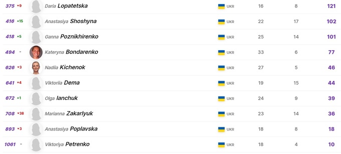 Костюк повертається в топ-150 і вперше в кар'єрі обходить Лесю Цуренко. Катерина Козлова втратила 10 позицій і тримається в самій кінцівці першої сотні. Даяна Ястремська повернулася в топ-25.