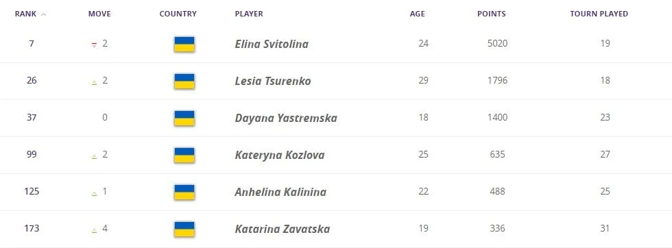 Друга ракетка України Леся Цуренко трохи поліпшила свої позиції і тепер займає 26 місце. Даяна Ястремська зберегла 37 позицію, а Катерина Козлова перемістилася до першої сотні і тепер 99-та.