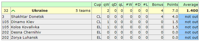 Якщо до цього додати чотири бонусних очка "Шахтаря" за участь на груповому етапі Ліги чемпіонів (туди донецький клуб потрапив автоматично), маємо в сумі 7 пунктів, що трансформується в таблиці коефіцієнтів УЄФА в 1,4 бала (7 очок ділимо на 5 клубів).