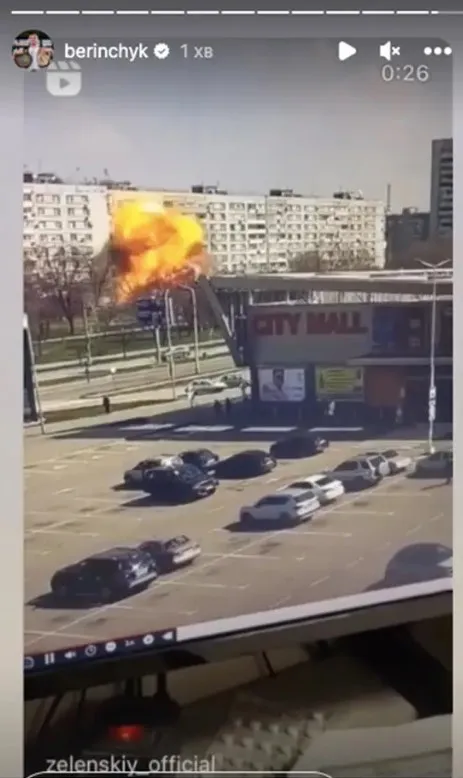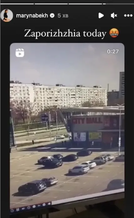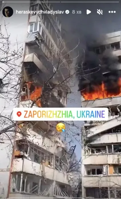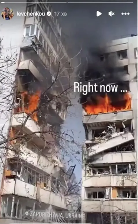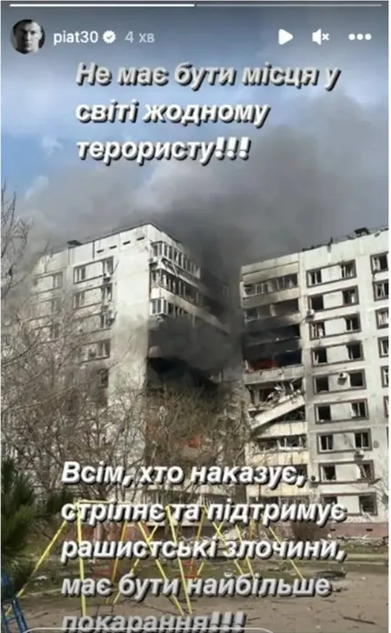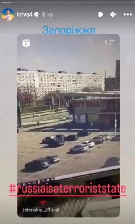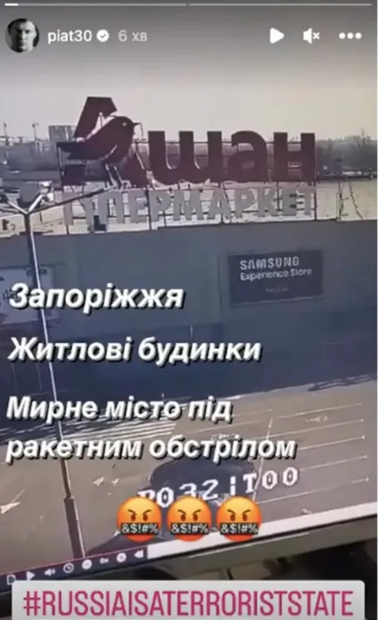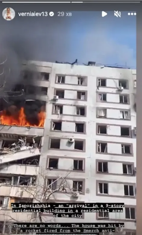 "Запоріжжя, житлові будинки. Мирне місто під ракетним обстрілом. Немає бути місця у світі жодному терористу!!! Всім, хто наказує, стріляє та підтримує рашистські злочини, має бути найбільше покарання",