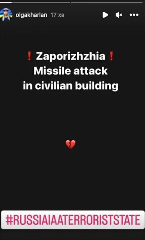 "Запоріжжя! Ракетна атака на цивільну будівлю. Росія – країна-терорист", – заявила фехтувальниця Ольга Харлан.