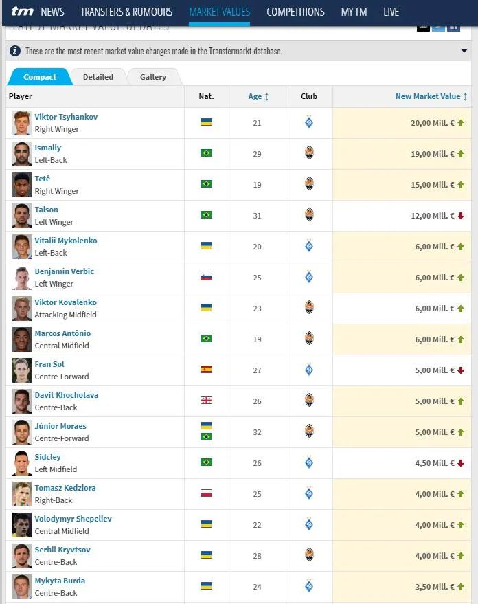 По 6 мільйонів євро також коштують словенець Беньямін Вербич ("Динамо"), Віктор Коваленко та Маркос Антоніо (обидва "Шахтар"). На дев'ятій позицій нападник "Динамо" Фран Соль 5 мільйонів євро, який подешевшав на мільйон. Замикає топ-10 центрбек "Шахтаря" Давид Хочолава – теж 5 мільйонів євро.