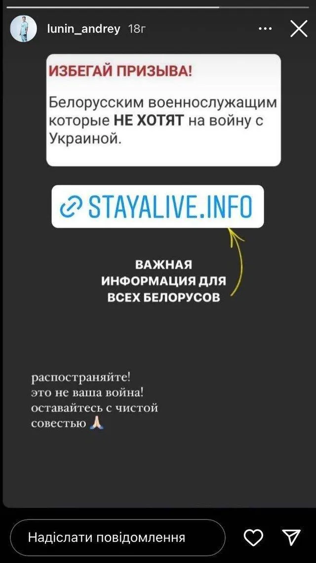 Лунін у своєму інстаграмі виклав посилання для білорусів з інформацією як уникнути втручання у війну проти України.
