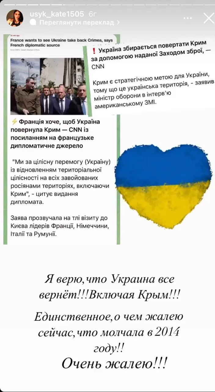 Я вірю, що Україна все поверне. Включно з Кримом. Єдине про що я жалкую зараз, так це через те, що мовчала у 2014 році. Дуже шкодую,