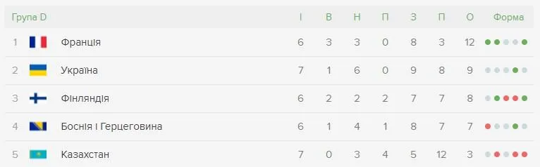 - Перше місце посідає збірна Франції, яка за шість матчів набрала 12 очок (три перемоги та три нічиї). Різниця забитих-пропущених голів – 8:3. Українці з французами двічі зіграли внічию 1:1