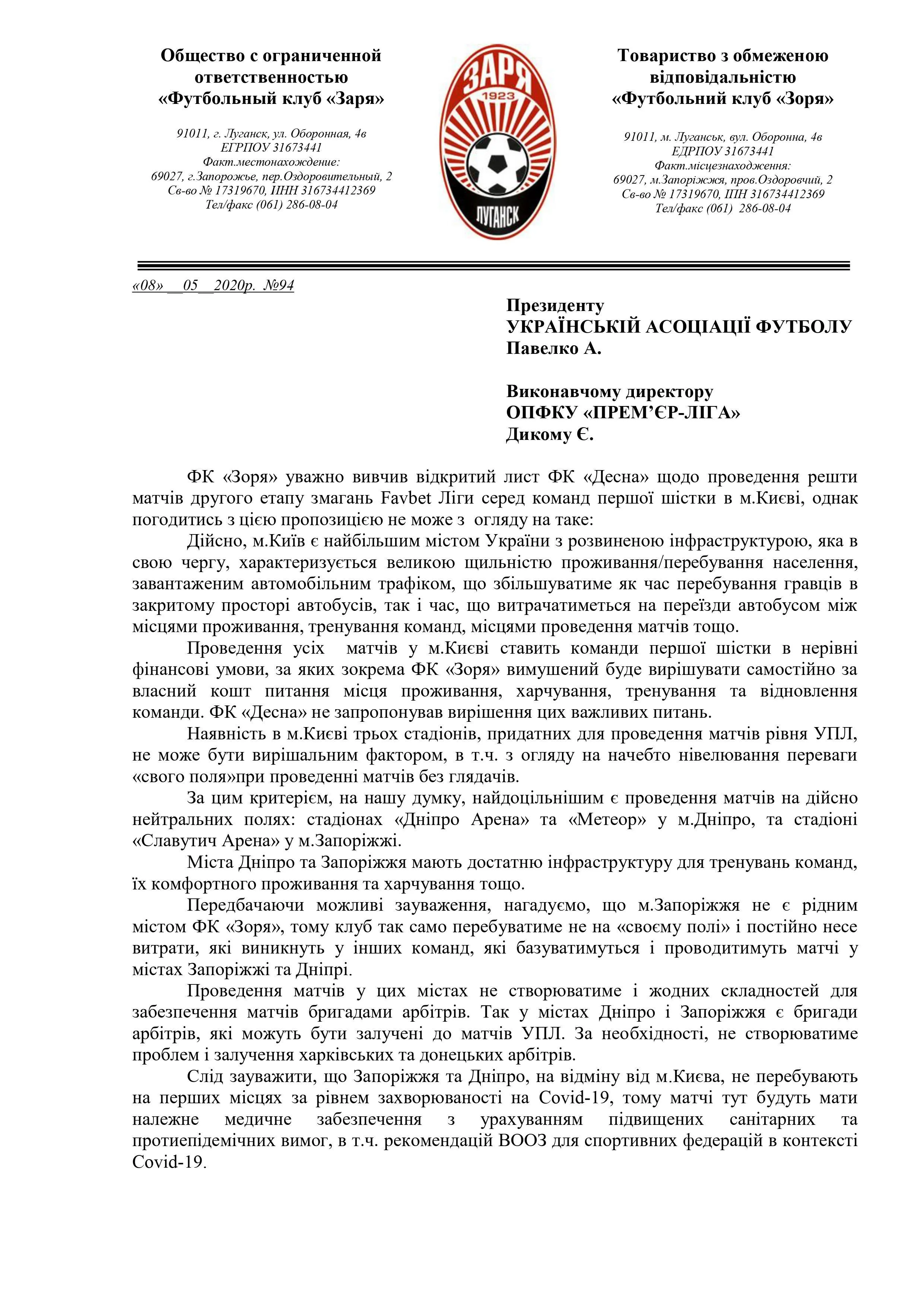 Як інформує сайт "Зорі", клуб написав лист Українській асоціації футболу (УАФ) та УПЛ з пропозицією дограти першу шістку в Запоріжжі і Дніпрі.