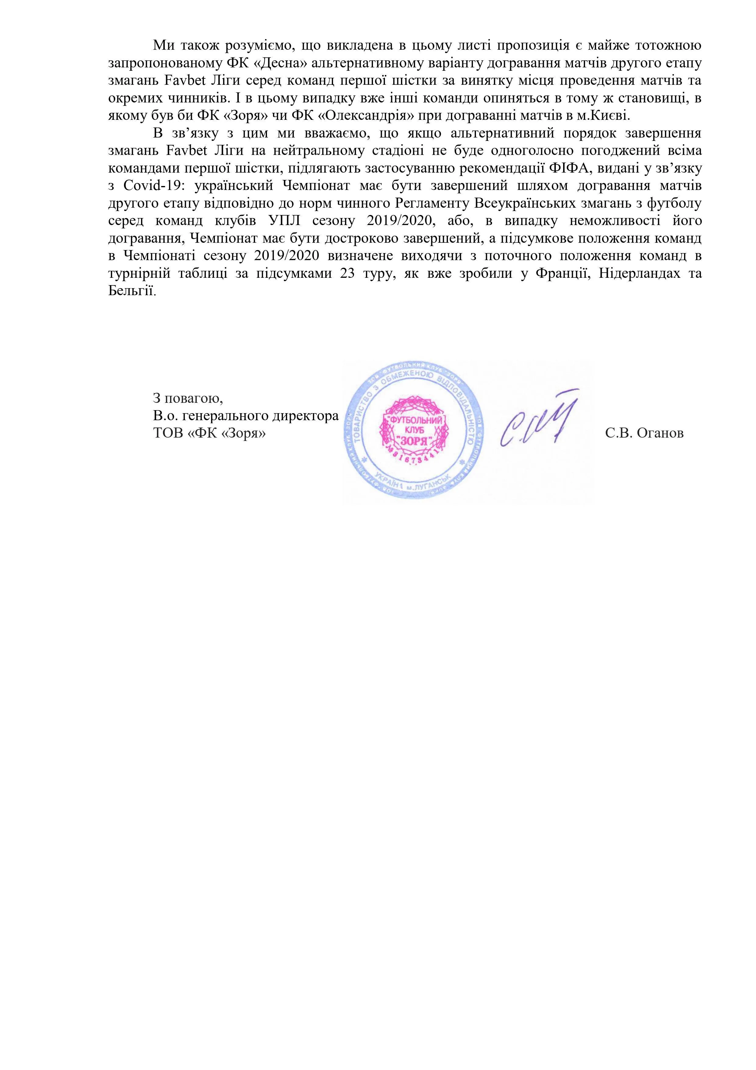 У "Зорі" заявили, що якщо альтернативний варіант догравання не буде узгоджений усіма клубами, то чемпіонат повинен бути достроково завершений, враховуючи положення команд після 23-го туру УПЛ.