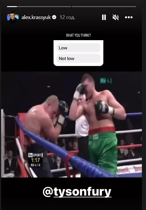Промоутер Олександра Усика вирішив потролити Тайсона Ф'юрі, який занадто багато говорить про українця. Олександр Красюк опублікував смішне фото із британцем з підписом: "Як думаєте, низький удар чи не низький?".