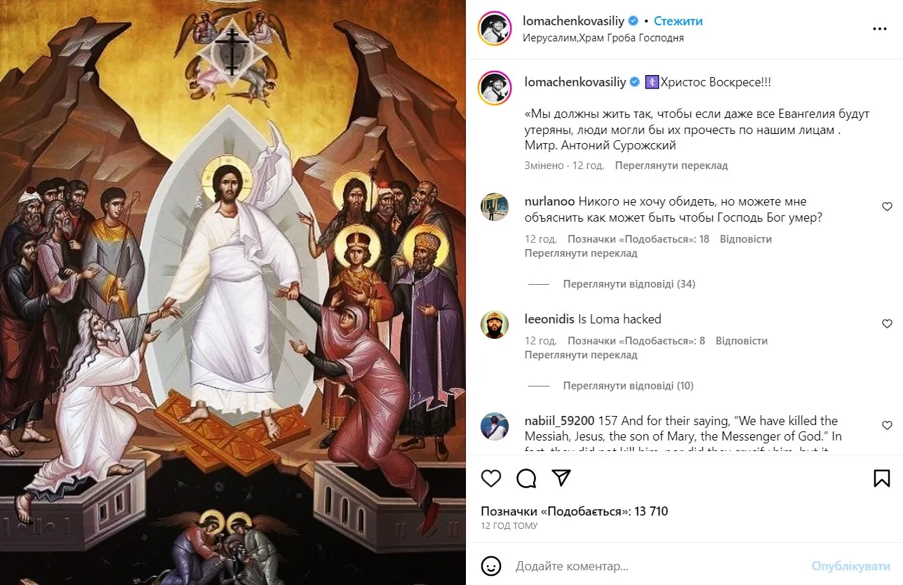 Боксер опублікував пост в інстаграм з приводу Великодня. У підписі під фотографією Ломаченко використав цитату митрополита Антонія Сурозького, єпископа Російської православної церкви.
