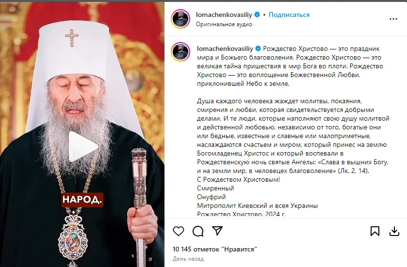 На своїй сторінці в інстаграм, яка має обмеження для жителів України, Ломаченко опублікував різдвяне поздоровлення від предстоятеля УПЦ МП митрополита Онуфрія. У своїй промові церковний діяч розповів, що другий рік поспіль українці відзначають свято "під звуки смертельних пострілів, якими вороги нищать нашу землю".