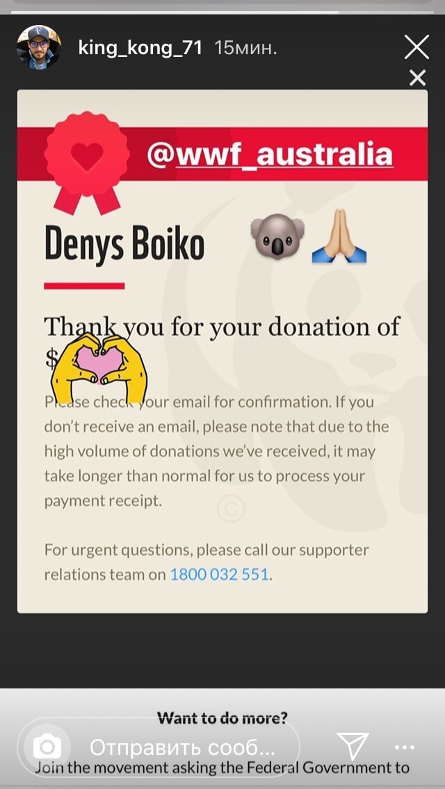 Бойко зробив грошовий внесок на підтримку порятунку тварин, які постраждали від пожеж в Австралії. Воротар розмістив в історії на своїй сторінці в Instagrami скріншот після пожертвування грошей.