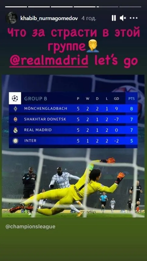 Росіянин Хабіб Нурмегомедов публічно на своїй інстаграм-сторінці підтримав мадридський Реал перед заключним матчем у Лізі чемпіонів проти Боруссії (М).
