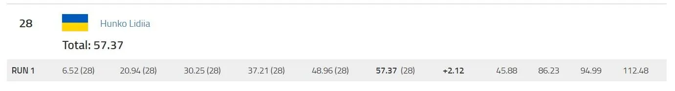 Українка фінішувала на 28 місці, показавши результат 1:57,37 секунди. Переможницею змагань стала американка Меєрс Тейлор Елана з результатом 1:50,50 с.