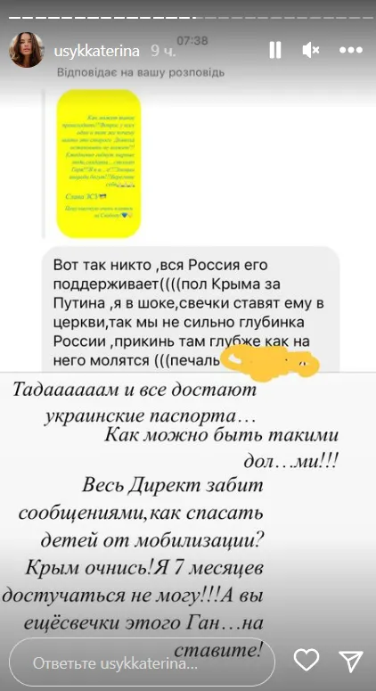 Весь дірект забитий повідомленнями, як рятувати дітей від мобілізації? Крим, прокинься. Я 7 місяців не можу достукатися. А ви ще свічки цього ган**на ставите", – написала Усик.