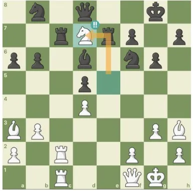 В чому ж сила цього ходу? Річ у тому, що тепер комунікації чорних порушено. Під боєм – дві фігури чорних та дві фігури білих. Але за рахунок націленості білих фігур на поле С8 Іванчуку вдається виграти ферзя за туру і коня.