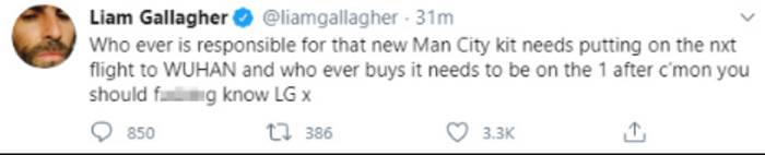 Ліам Галлахер розкритикував нову форму Манчестер Сіті, пожартувавши, що її творці повинні першим же рейсом бути відправлені в Ухань, який став першим епіцентром поширення коронавірусу.