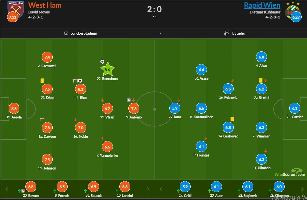 Вест Хем – Рапід: оцінки гравців / Скриншот із WhoScored