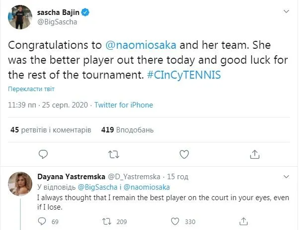 Тренер українки Саша Баїн привітав Осаку з перемогою у своєму Twitter. Наголосимо, що наставник у минулому тренував японську тенісистку. Але ці слова не сподобались Ястремській.