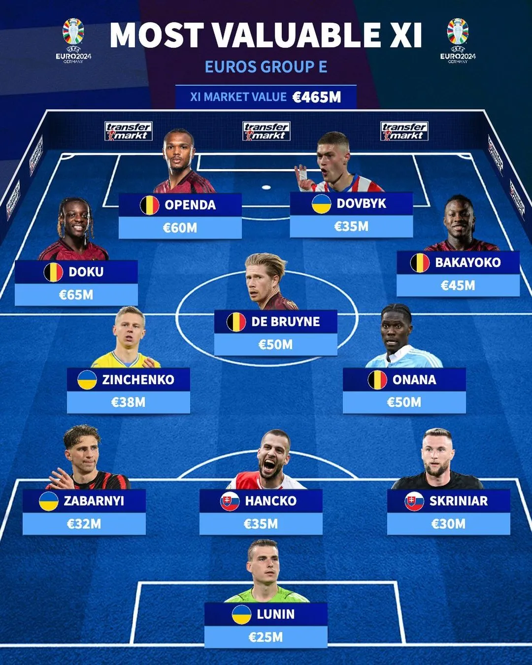 Натомість збірна Румунії не делегувала жодного свого футболіста до символічної збірної. Цікаво, що найдорожчим гравцем групи Е став вінгер збірної Бельгії Жеремі Доку. Футболіст Манчестер Сіті оцінюється порталом Transfermarkt у 65 мільйонів євро.