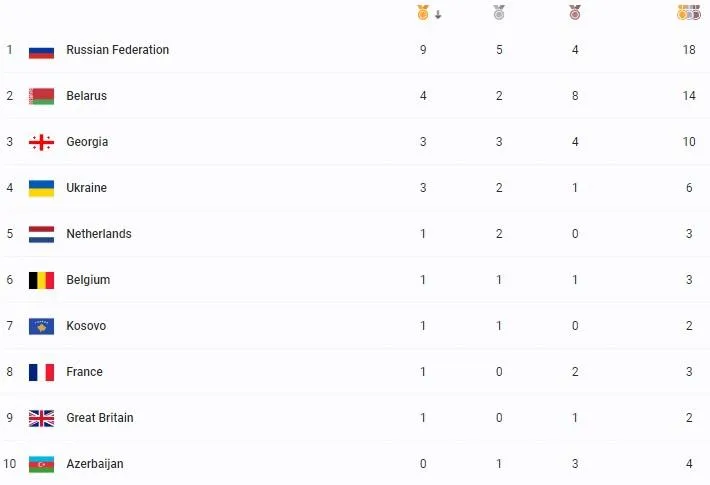 За підсумками першого дня змагань Україна посідає високе четверте місце у медальному заліку змагань (6 медалей, 2 золоті). Лідирує із солідним відривом збірна Росії (18 медалей, 9 золотих).