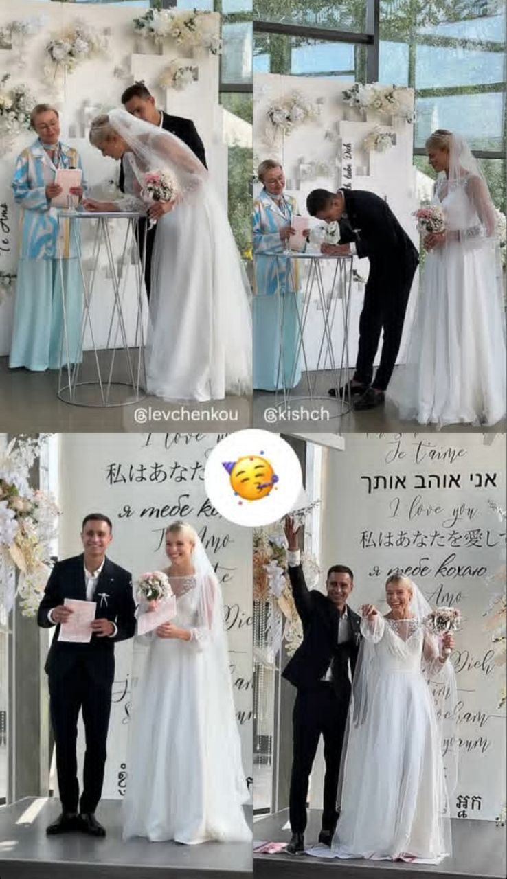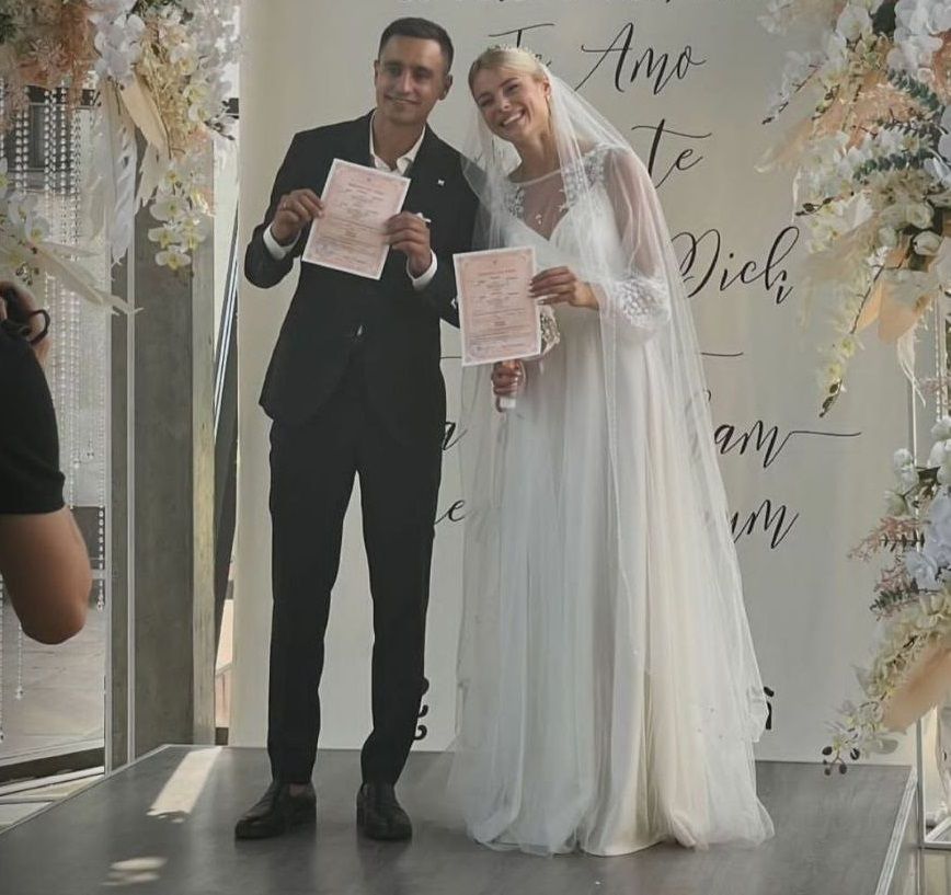 Юлія Левченко обрала красиву білу сукню. Натомість наречений обрав класичний чорний костюм та білу сорочку. Дуже стильно та ефектно.