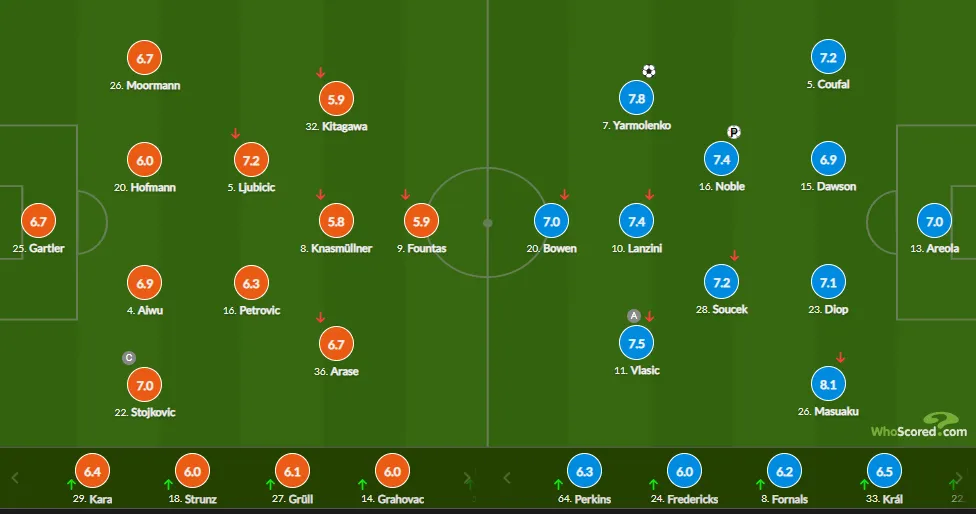 Ярмоленко був близьким у другому таймі до асиста, але Томаш Соучек не скористався 100% шансом. За таку надактивність український вінгер отримав від авторитетного порталу WhoScored 7.8 балів – це другий найкращий показник серед польових гравців обох команд.