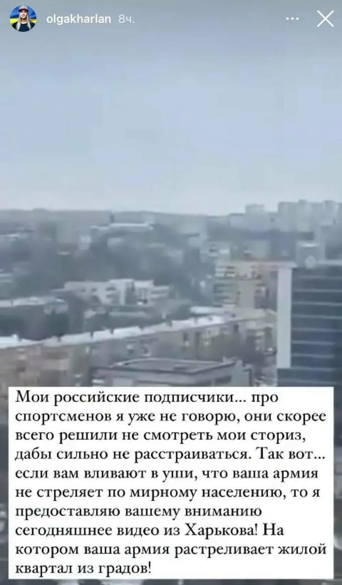 "Мої російські підписники, про спортсменів я вже не кажу, вони, швидше за все, вирішили не дивитися моїх сторіз, щоб сильно не засмучуватися. Так от, якщо вам вливають у вуха, що ваша армія не стріляє у мирне населення, то я представляю вашій увазі сьогоднішнє відео з Харкова! На якому ваша армія розстрілює житловий квартал із градів", – почала вона.