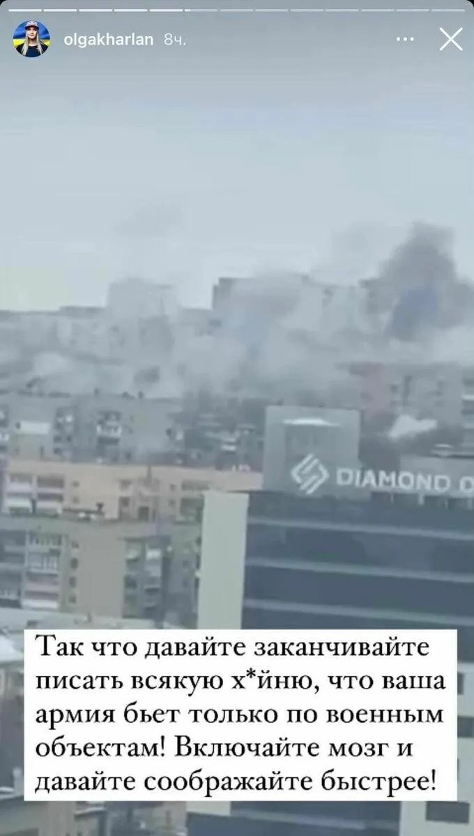 "Тож давайте закінчуйте писати всяку ху*ню, що ваша армія б'є лише по військових об'єктах. Включайте мозок і давайте думайте швидше", – написала Харлан.